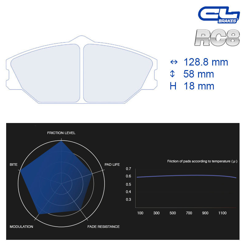 - RC8/RC8R: coefficient de friction très haut u = 0.60. RC8R avec usinage radiateur. Application Competition haute niveau.