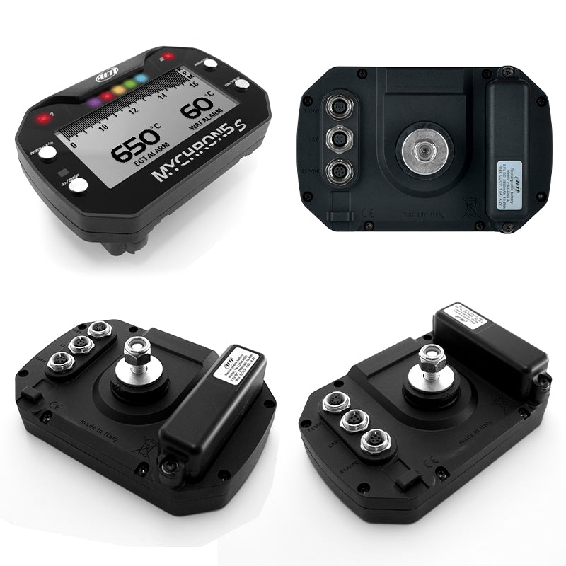 MyChron5S, carica batterie con cavo, cavo RPM, 1 sensore temperatura + cavo prolunga. Manuale utente e software Race Studio 3 scaricabili gratuitamente dal sito AiM.
